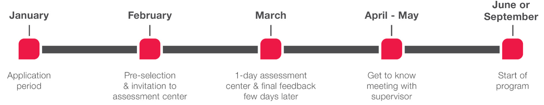 We accept online applications in January each year. After a pre-selection, we then assess candidates in March at our head office in Uzwil, Switzerland. Our Assessment Center conducts a one-day assessment with various exercises and interviews, which allow us to get to know you better. If you are successful, we will offer you an exciting journey at Bühler. You can choose to start the program in either June or September of the same year.