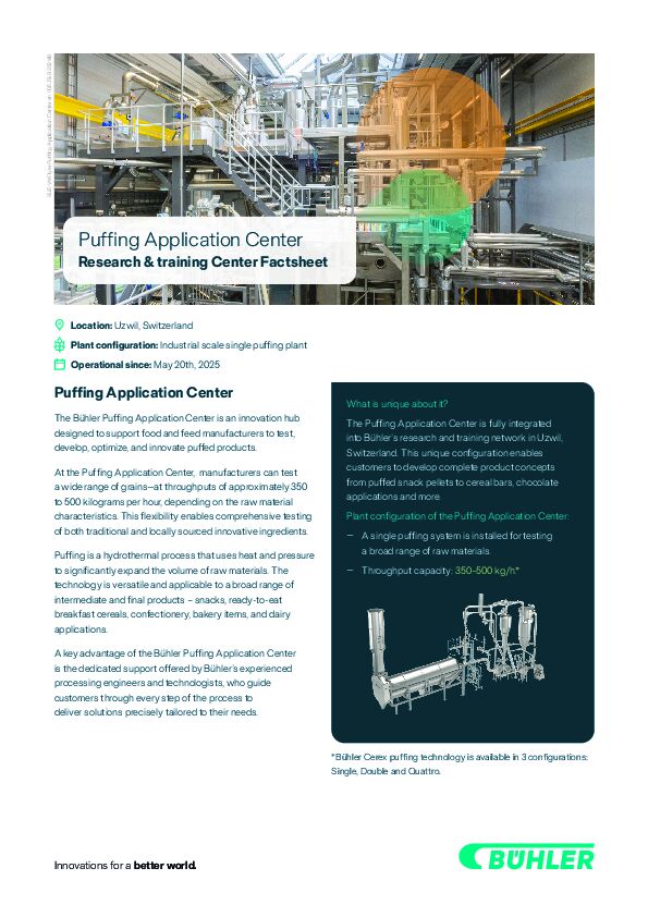 The Puffing Application Center is fully integrated into Bühler’s research and training network in Uzwil, which includes facilities such as the Grain Innovation Center, Flavor Creation Center, Food Creation Center, and Protein Application Center. This unique configuration enables customers to develop complete product concepts – from puffed snack pellets to cereal bars and chocolate applications – all within a unified innovation process.